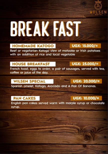 The Wilsen Hotel Multi Cuisine Restaurant is open for breakfast, lunch and dinner daily. Enjoy a traditional Ugandan cuisine buffet including matooke, fresh lake fish – tilapia, potatoes, yam, meats and hints of International cuisine. The restaurant is open for lunch and dinner daily.